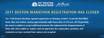 Las inscripciones para el Maratón de Boston 2011, se abrieron este lunes 18 de octubre a las 9 de la mañana, y, en tan sólo 8 horas, los 25.000 cupos ya se habían agotados, es el registro más rápido en toda la historia de esta carrera, e inclusive los organizadores aún se encuentran asombrados.